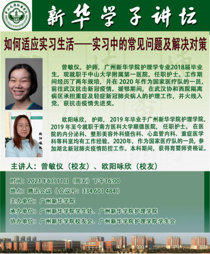 2021年6月11日下午,由122cc太阳集成游戏主办,122cc太阳集成游戏护理学院、122cc太阳集成游戏学生处承办的新华学子讲坛“如何适应实习生活——实习中的常见问题及解决对策”在腾讯会议线上直播举行。