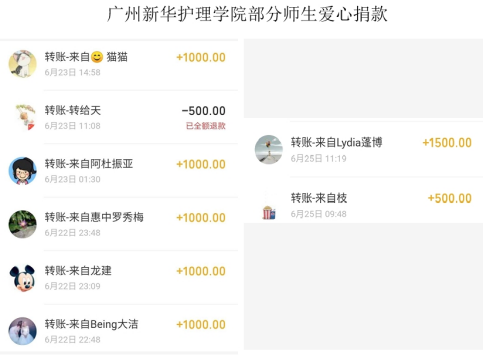 护理学院师生了解到消息后积极行动,自发为学校抗疫捐款捐物、奉献爱心,用实际行动支援学校抗疫。没过多久,在线募捐活动瞬间在广州新华护理学院师生间传送。在学校抗疫期间,护理学院共收到爱心善款人民币64693.86元。