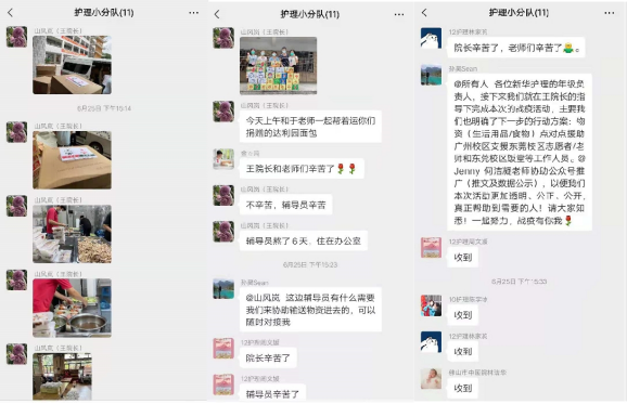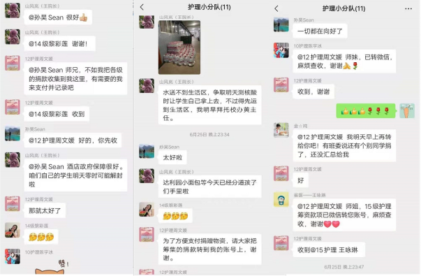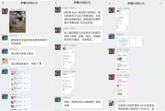此外,护理学院院长王秀岚、校友会会长孙昊迅速组织护理学院各年级学生建立“护理小分队”微信群,以便收集抗疫期间师生所需、及时购置相关物资,并确保物资以最快的速度顺利送达各位师生手中。