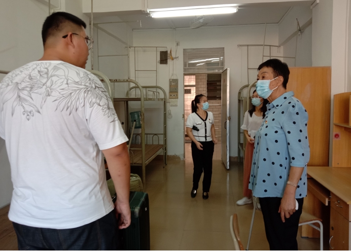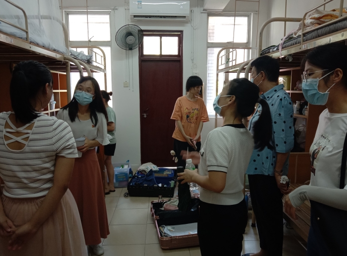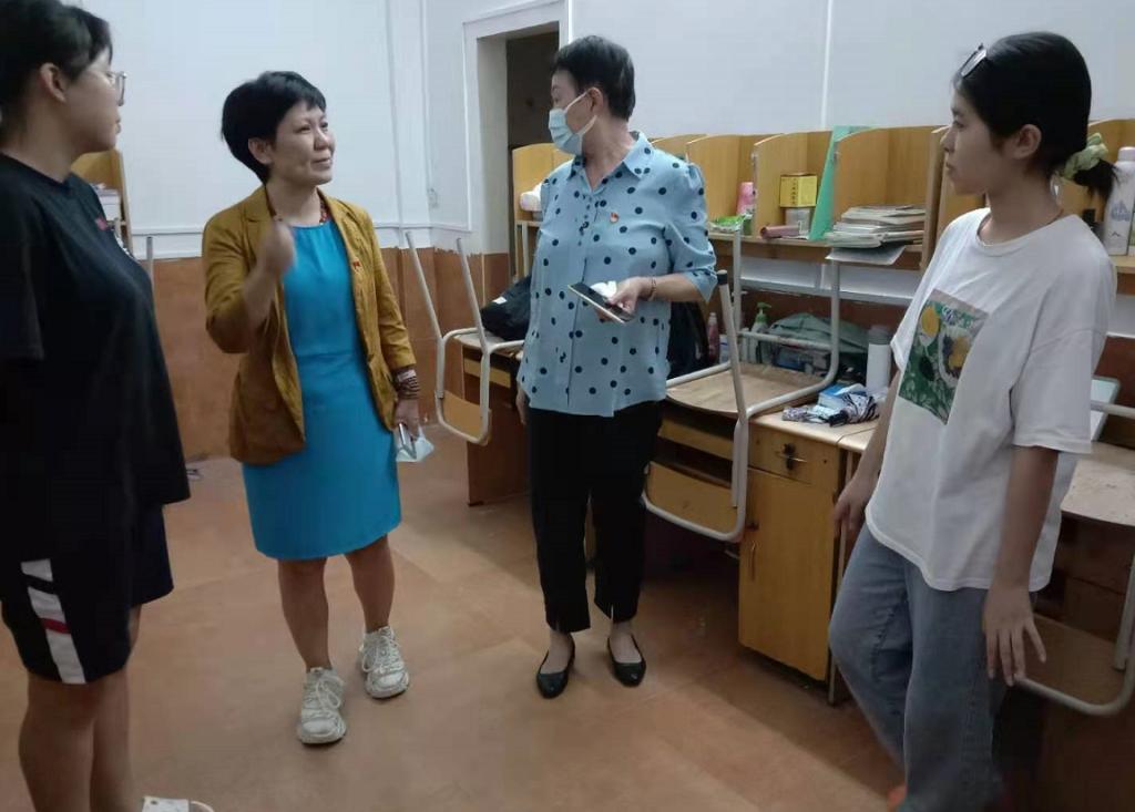 图为护理学院王秀岚院长、党总支书记于凤兰老师等一行走访学生宿舍