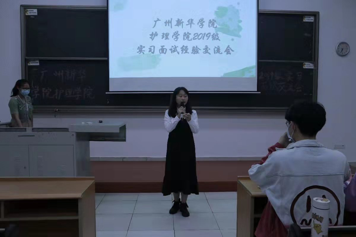 紧接着,李桂丹师姐介绍了自己的面试情况并分享准备简历时的小tips,如用数据使简历具体化、模板如何选择等等。此外,桂丹师姐向同学们介绍中山大学孙逸仙纪念医院的情况,鼓励大家新华学院的护理学子很受医院欢迎,希望同学们不要过于焦虑,以平常心对待实习面试。