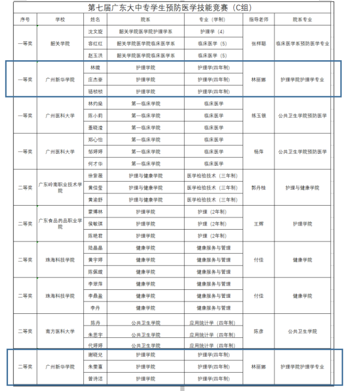 我校护理学院有林丽娜指导和带队的2支队伍参加健康知识竞赛(C组)决赛,比赛内容包括“传染病”、“慢性非传染性疾病”等十大健康主题的知识。赛前选手们认真充分的备赛和带队老师的精心指导,决赛经过紧张、有序、激烈的角逐,我校选手在48支队伍中脱颖而出,骆桢桢、林璇、庄杰豪团队荣获健康知识组一等奖,曾诗洁、谢晓兒、朱雯惠团队荣获健康知识组二等奖,再次为我校增添一份荣誉。