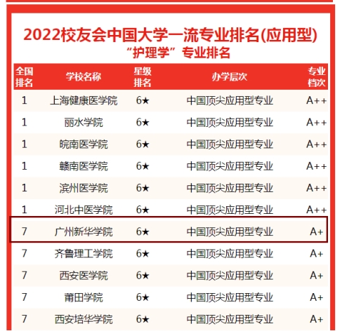 根据2022年3月30日,全国第三方大学评价机构艾瑞深校友会网(Cuaa.Net)撰写完成、科学出版社出版发行的《2022校友会中国大学排名—高考志愿填报指南》最新发布2022校友会中国大学一流专业排名“护理学”专业排名,我校护理学专业上榜中国顶尖应用型专业。