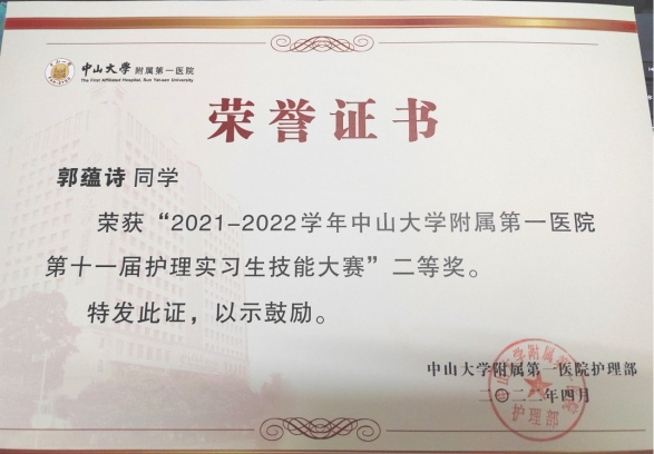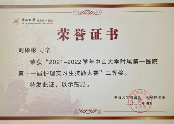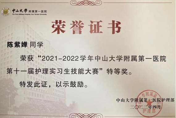 适逢春夏之交,万物葱翠的美好时节,九月实习生涯已接近尾声。为了检验同学们在临床实习中的所学所得,中山大学附属一医院护理部于2022年4月2日开展了2021-2022年度全院护理实习生技能大赛,大赛由在中山大学附属第一医院实习的九所学校共112名实习生参与。我校护理实习生在平时的实习中积极训练基础技能,不断提高自身综合能力,备受赞誉。在此次大赛中努力拼搏,学以致用,争创佳绩,展现着新华护理学子的风采。2022年4月15日在中山大学附属第一医院“心存天使梦,情系中山医”2021-2022年度护理实习生总结大会的颁奖现场,我校实习生喜得佳绩,斩获特等奖及二等奖。