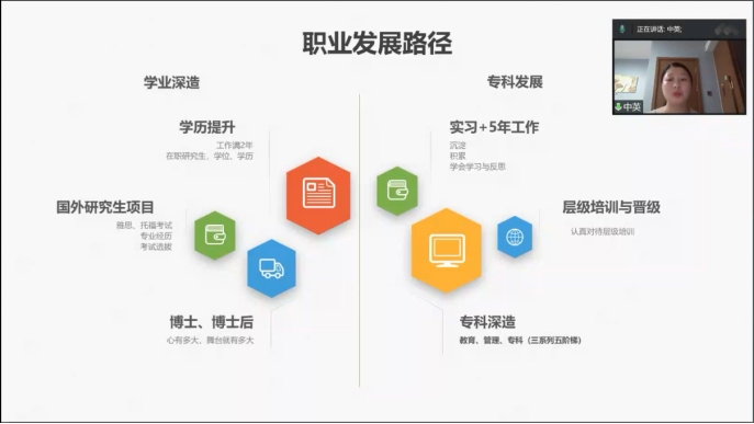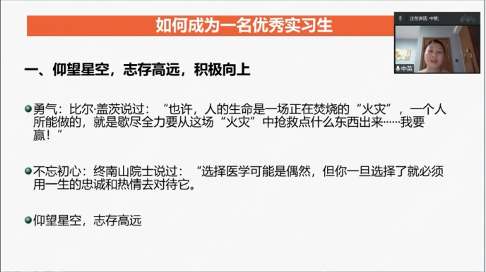 活动伊始,黄中英老师点明了实习是护生梦想的开始,我们要在实习的每一次修正过程中,实现自我认知评价,分析环境,进行职业规划,最终执行计划。黄中英老师从自我认知和环境分析方面帮助同学们思考和定位实习身份的转变,在适应的过程中,逐渐确认内心职业发展方向。黄中老师引用了钟南山院士的一句话“选择医学可能是偶然,但你一旦选择了,就必须用一生的忠诚和热情去对待它”,指出了成为护士是我们人生中的一种选择,一旦做出了选择,就要对自己的选择负责,坚持到底,无愧于心。