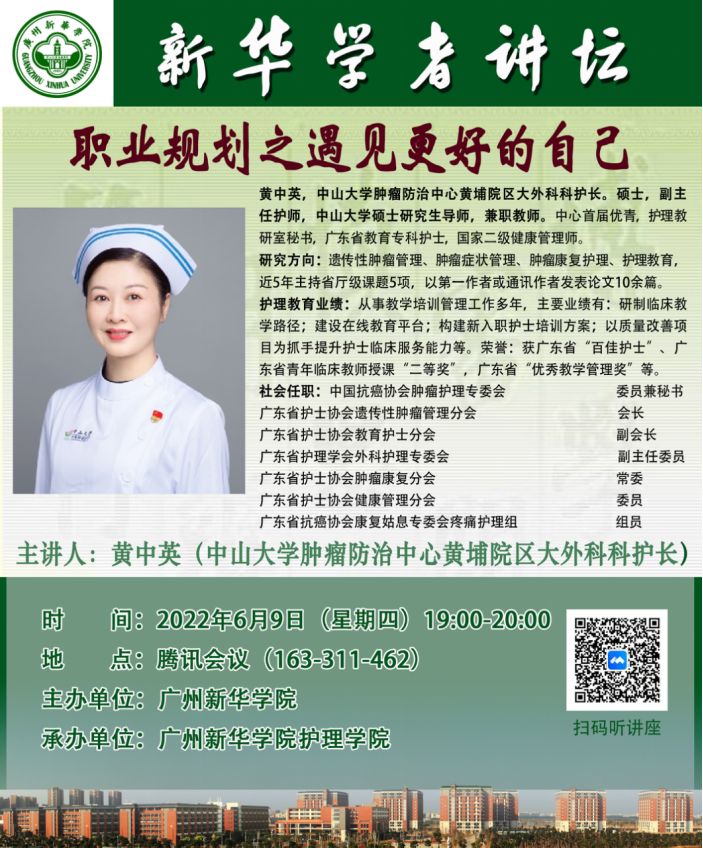 2022年6月9日19:00—20:00,由122cc太阳集成游戏护理学院承办的新华学者讲堂“职业规划之遇见更好的自己”在腾讯会议线上直播举行。此次学者讲堂的主讲人是中山大学肿瘤防治中心黄埔院区大外科科护士长、中山大学硕士研究生导师黄中英护士长。护理学院院长王秀岚老师、副院长黄洛莹老师、教师代表以及2019级护理学全体学生在线参会。此次讲堂由护理学院副院长黄洛莹老师主持。