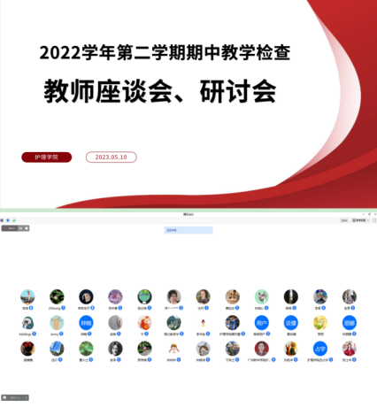 2023年5月10日中午12:30,护理学院线上召开了2022学年第二学期期中及教学检查教师座谈会及教学研讨会。会议由执行院长王秀岚主持,护理学院全体教职工出席了会议,会议围绕本学期的教学工作展开。