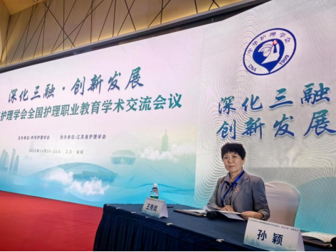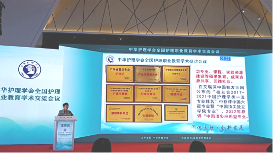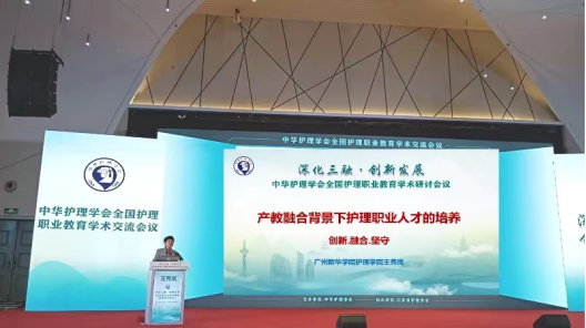 王秀岚教授受邀主持“优秀论文大会交流“分会场,并就“产教融合背景下护理职业人才的培养”进行大会交流。