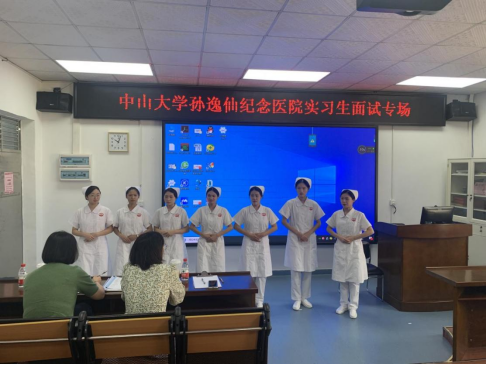 2023年11月9日,中山大学孙逸仙纪念医院(以下简称“中山二院”)肖琳护士长和黄艺芳老师前往护理学院进行实习生招聘面试。王秀岚院长、黄洛莹副院长、于凤兰老师热情地接待了两位老师。参与面试的同学们身着护士服,意气风发、精神饱满地迎接两位老师的到来。