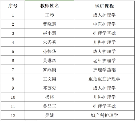 教师试讲制度是加强师资队伍建设、保证教学质量的重要手段。护理学院高度重视教师试讲制度的落实,教师首先介绍自己的学历、工作等背景及任课理由,接着进行8分钟的试讲。