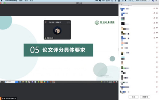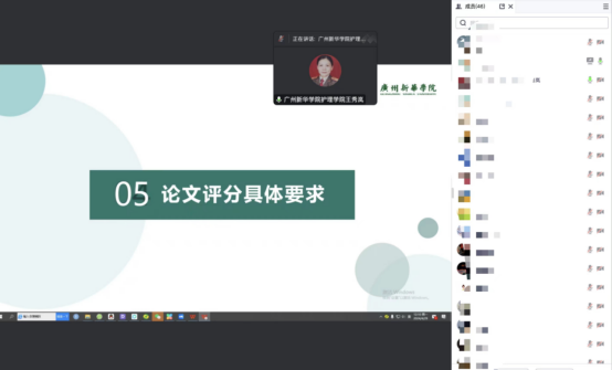 为进一步加强本科论文答辩工作的过程管理,提高我院本科生论文质量,根据学校教学工作的要求以护理学院2024届本科生毕业论文工作计划时间节点的工作安排,护理学院于2024年4月29日12点召开线上工作会议,我院执行院长、党总支书记王秀岚教授,副院长黄洛莹及各位论文指导老师等46名老师参加此次线上会议。