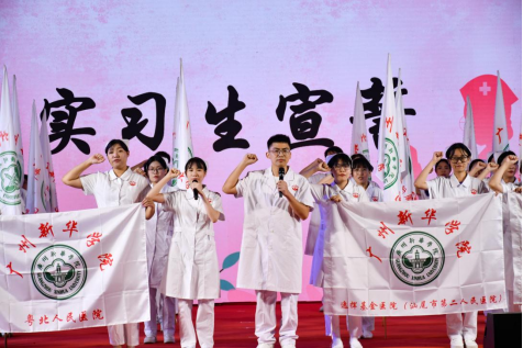 紧接着,进入授旗仪式与实习生宣誓的环节,“路漫漫其修远兮,吾将上下而求索。”在此环节我们深深感受到在过去的十个月里,护理学院2020级实习生们经历了人生中一段宝贵的实习经历,这段经历将永远镌刻在她们的心中,成为她们未来职业道路上最坚实的基石。十个月的实习工作转瞬即逝,他们如同冉冉升起的朝阳,怀揣着对护理事业的热爱和敬畏,踏入繁忙而充满挑战的医院中继续挥洒青春汗水。接下来,这份传承,这面旗帜,将要传递给我们新一任的护理实习者——护理学院2021级实习生们。护理学院执行院长王秀岚教授和名誉院长李亚洁教授分别为护理学院今年新增的4家实习基地的组长们授旗。让我们一起,以最崇高的敬仰,来迎接这伟大的传承与赓续!