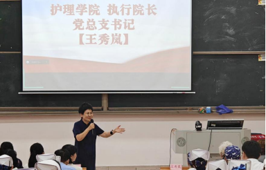 紧接着,王秀岚院长上台发表讲话。她首先强调了安全的重要性,并提出护士应成为患者的代言人的观点。她明确指出,沟通是医疗工作中最为关键的一环,我们需怀揣对生命的敬畏之心。为此,她援引了范仲淹的名言:“老吾老以及人之老,幼吾幼以及人之幼”,以此倡导学生应以同理心去理解和关心每一位患者,所谓“理解病人的不理解,宽容病人的不宽容。”王院长进一步提醒在座的同学们,要早做准备,早开始论文的撰写和护理资格考试的备考工作。