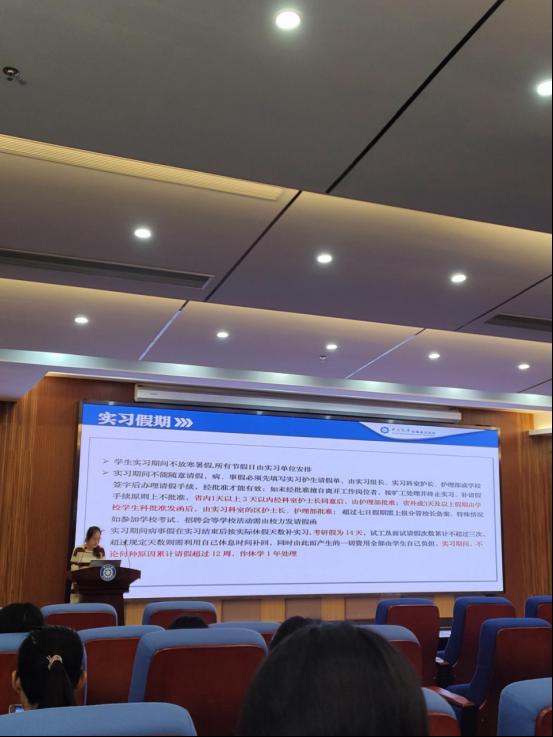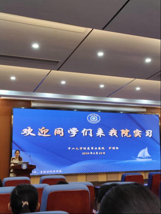 6月28日早上9点整,护理实习生在中山大学第五附属医院凤凰厅3楼参加了护理实习生岗前培训。在6月28日上午,中山大学第五附属医院护理部赵黎老师就内外各科特点进行讲解,并且对实习生安全、实习生请假、突发事件处理等医院规章制度作出详细指导。