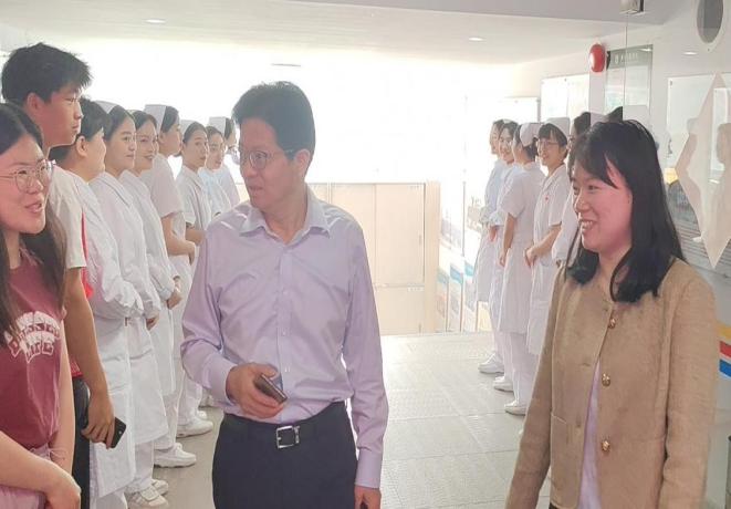招聘结束后,护理学院执行院长王秀岚与惠亚医院的领导进行交流。惠亚医院的面试团队对这批表现优秀的新华学子给予了高度的肯定。王秀岚院长对惠亚医院为学生提供的招聘机会表示了诚挚的感谢,王院长指出,此次招聘不仅是就业选择,更是职业发展的重要起点,医院提供的科研、临床、教学三维发展平台,将助力新华学子实现从专业人才到行业骨干的跨越式成长。