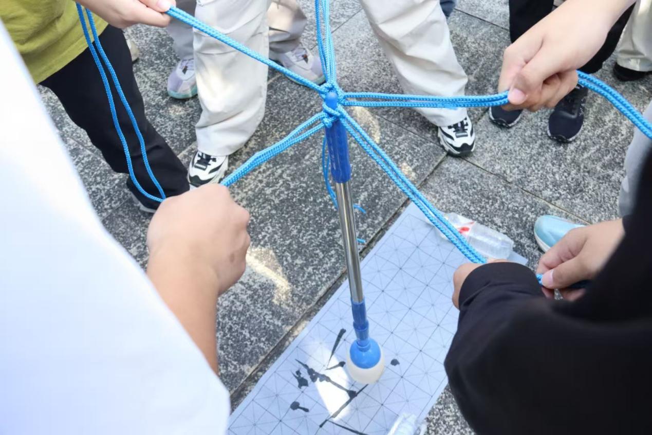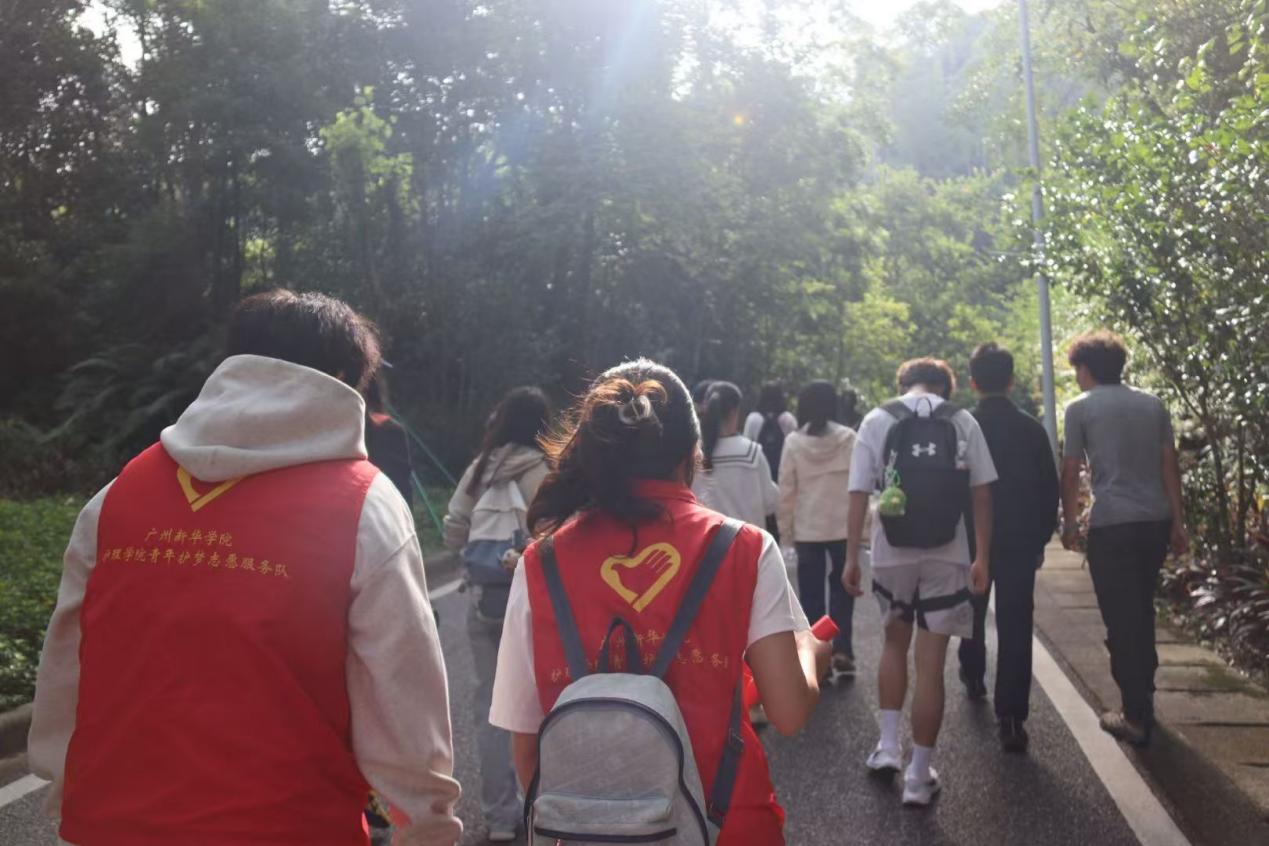热身结束后,各小组结伴登山,途中遵循“安全第一、结伴而行”原则。休息点处,志愿者及时提供补给并指引方向;荷花池附近“神笔马良”游戏区,两组志愿者引导各小组协作拉绳,书写“奉献”“互助”等志愿口号,用时最短队伍斩获团队章。攀登途中,师生相互扶持、彼此鼓励,在欣赏山野风光的同时,深化了团队信任与责任担当。