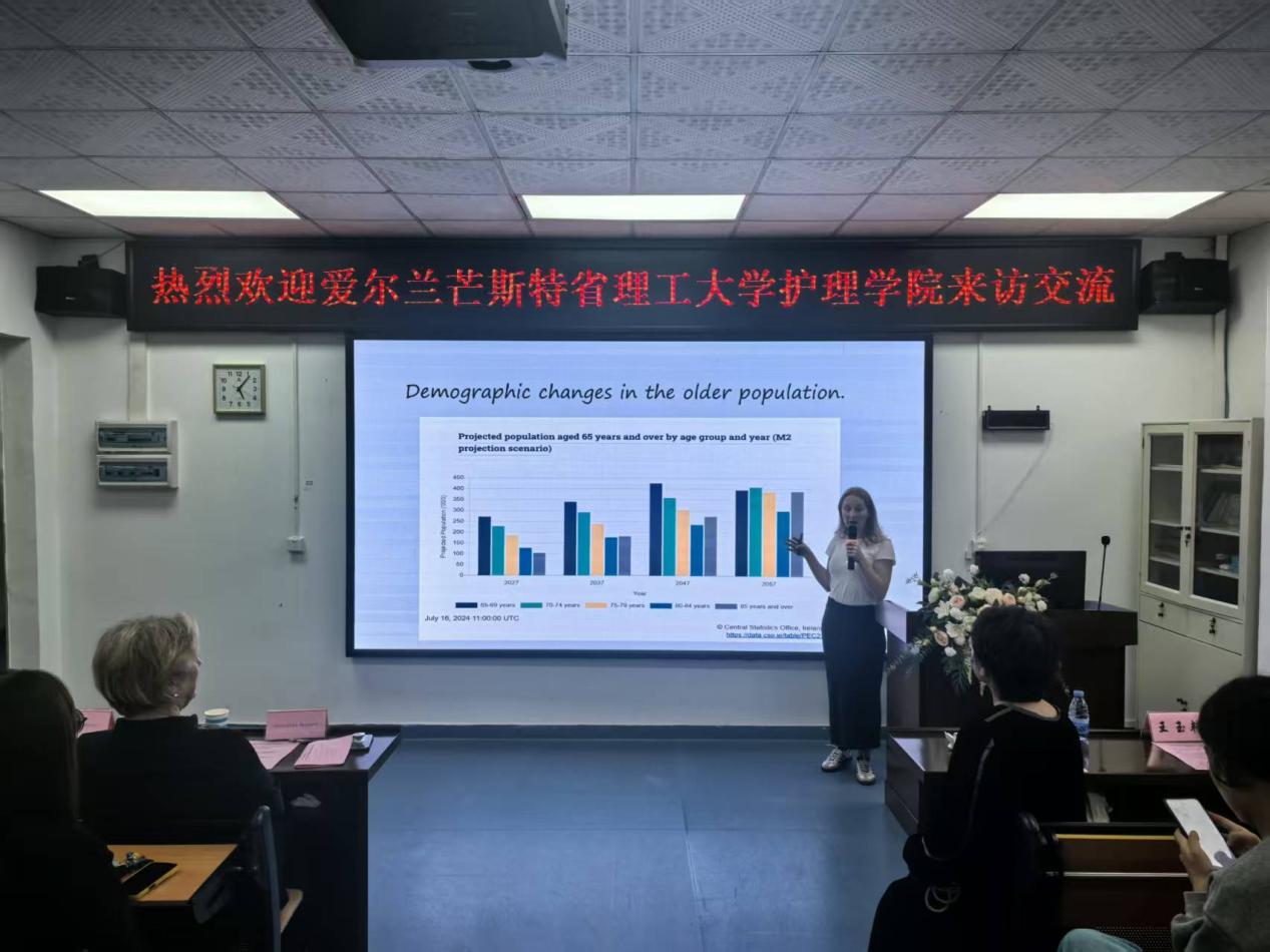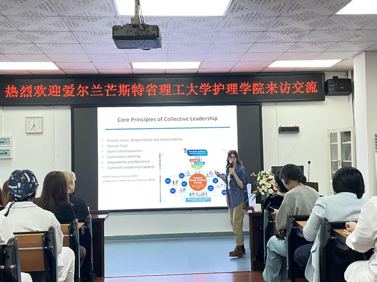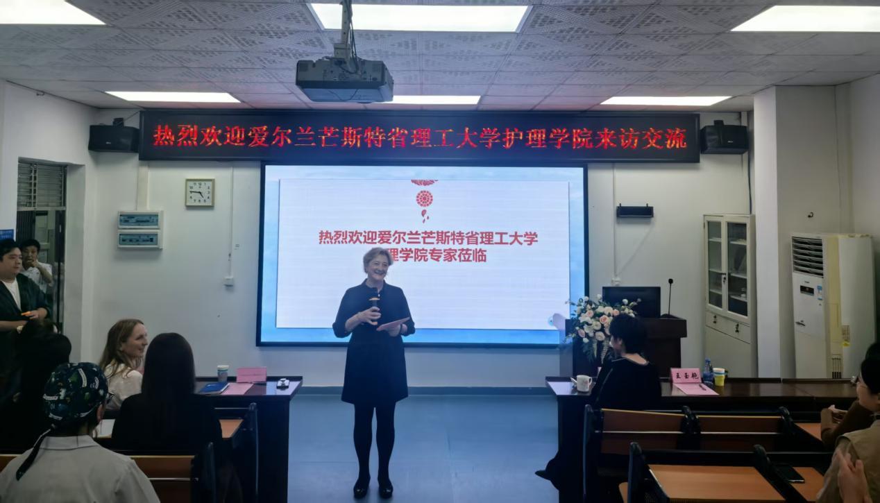 随后,爱尔兰芒斯特省理工大学护理学院院长Gerardina Harnett博士介绍了学校的情况。爱尔兰芒斯特省理工大学是爱尔兰一所公立的理工院校,由特拉利理 工学院和科克理工学院合并而成,是爱尔兰的第二所理工大学,仅次于都柏林理工大学。学校共有横跨科克郡和凯里郡的6个校区。学校目前拥有在校生人数18000余人,教职工及行政人员2000 余人;学校拥有6个卓越的研发中心、100多个学生俱乐部和社团;面向学生提供了140多种课程,开设一系列学术课程并颁发学士学位和硕士学位证书,与全球120多所顶尖大学有合作。其中,护理学院是爱尔兰护理教育与研究的重要基地,在学科建设、人才培养、科研创新等方面具有鲜明特色和领先优势。她表示,希望通过此次访问,加强与中国高校在护理教育领域的合作,共同推动护理人才培养与国际护理事业的发展。