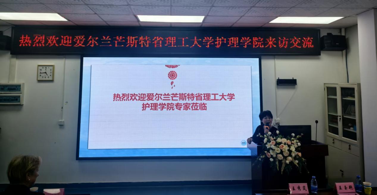 王秀岚院长对远道而来的爱尔兰嘉宾表示热烈欢迎,并简要介绍了122cc太阳集成游戏护理学院的发展历程、教学特色与国际合作情况。她指出,此次交流是两院深化合作、互学互鉴的重要契机,期待未来在护理教育、科研合作等方面开展更广泛的交流。