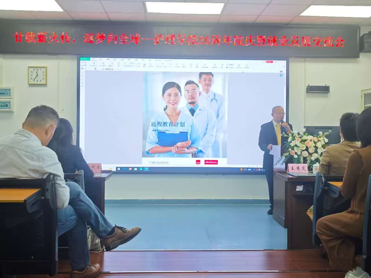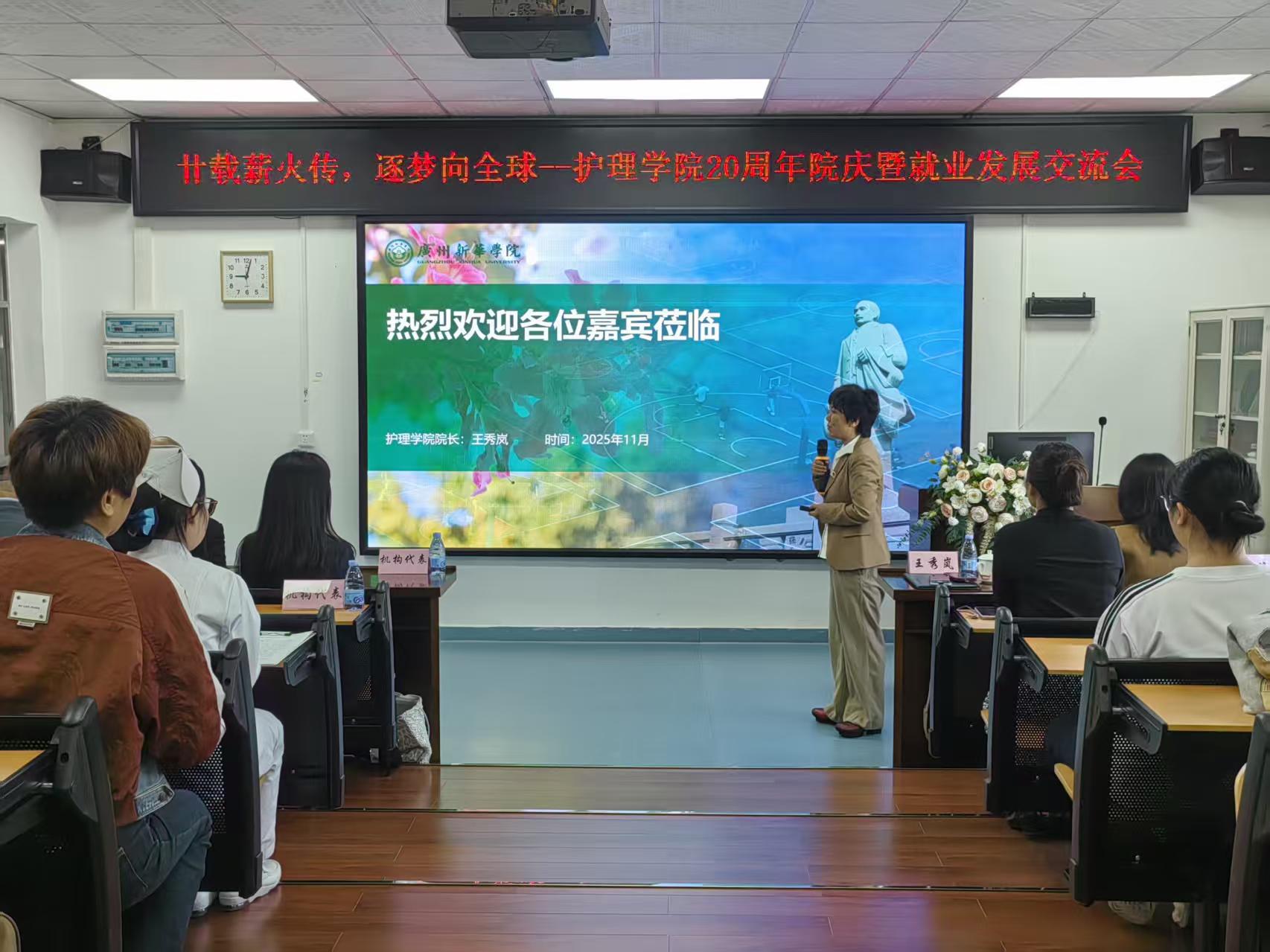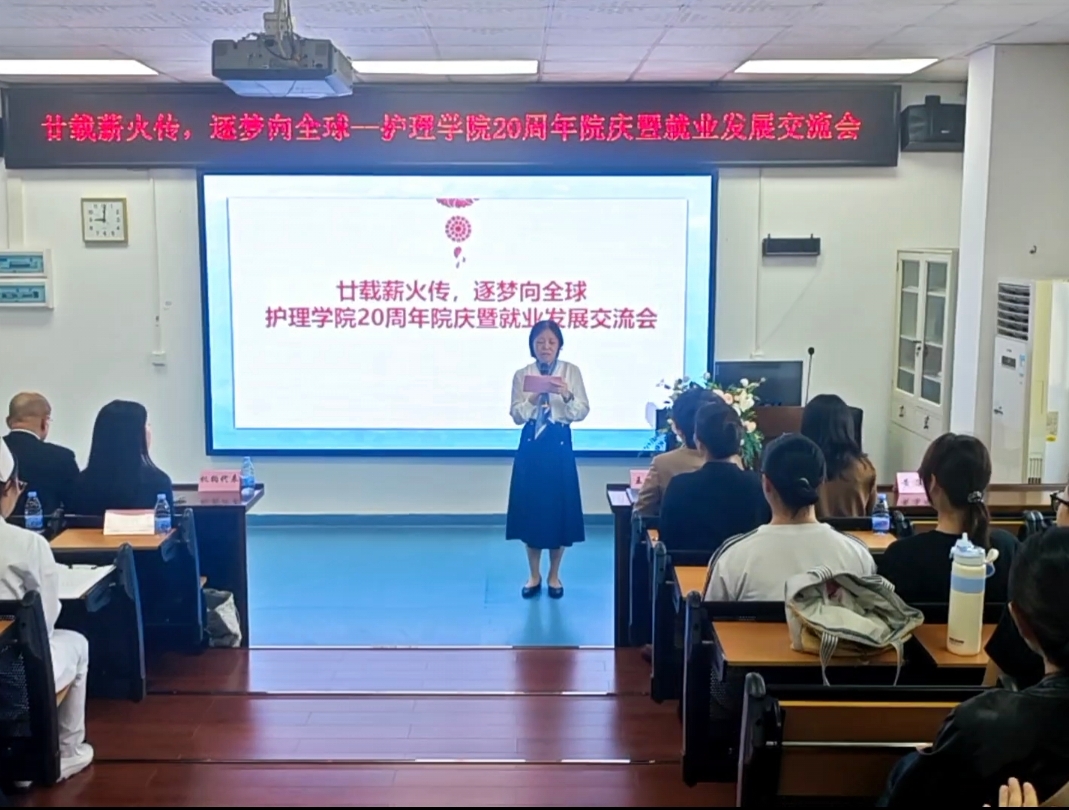 2025年11月16日,122cc太阳集成游戏护理学院以“廿载薪火传,逐梦向全球”为主题,在笃行楼三楼护理学院实验实训中心示教室举办 20周年院庆暨就业发展交流会。2025年11月,正值122cc太阳集成游戏20周年校庆月,护理学院也迎来20周年生日,学院举办此活动共贺校庆院庆。护理学院党总支书记、执行院长王秀岚,副院长黄洛莹、党总支副书记钟婉、教工党支部党员教师及学院教职工代表、各年级学生及家长代表、校友代表,以及瑞典、德国、香港地区就业项目机构代表等近150人齐聚一堂,共溯办学初心、共探发展路径、共拓就业新局。这场将 “家长会” 搬进高校的特别活动,因满满的干货与创新形式,让现场掌声不断。