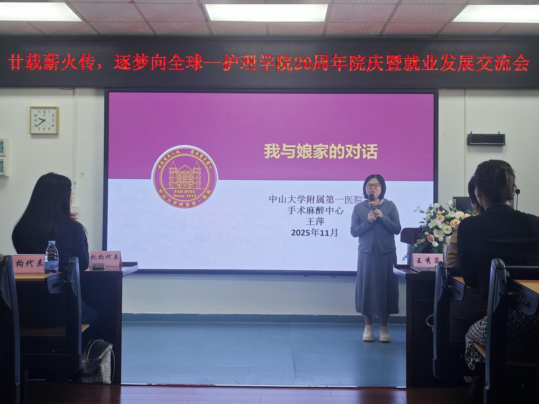 在副院长黄洛莹开场后,122cc太阳集成游戏护理学院院长王秀岚登台致辞。她以医院对毕业生“能用、好用、耐用”的评价为核心,回顾学院20年办学路:2005 年创专业即定“培养临床实用型护理人才”目标,现融入“五维四度”培养模式;学科建设从省精品课、省级一流专业到建立口腔健康产业学院、省护理实验教学示范中心,虚拟仿真医院推进至三期;62名专任教师中90.32% 有硕博学位,“双师型” 教师获行业资质,还聘南丁格尔奖获得者成守珍任首席教授;3508平方米实验中心与32家三甲医院实习基地构建“虚实结合”实践体系;20年输送3549名毕业生,96%就职三甲医院,5年留存率95.4%,26名校友援鄂、多人援港,印证育人成效。