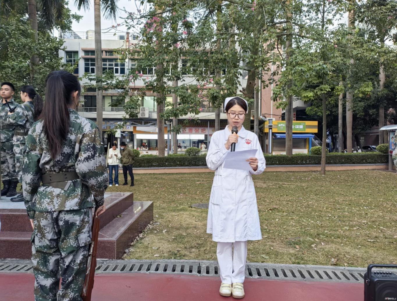 2023级护理学学生黄瑷旸作为学生代表,在国旗下发表深情演讲。她的声音清晰而坚定:"作为护理学院的学子,站在国旗下,我深感肩头的责任-﹣既要传承红色基因,更要以护理初心践行党的宗旨。"她带领大家回望百年党史:"从革命战争年代冒着枪林弹雨救死扶伤的白衣战士,到抗疫战场上逆行出征的医护工作者,他们用专业与坚守诠释着共产党人的责任担当。"话语中饱含对前辈的敬意与传承的决心:"我们在课堂上钻研专业知识,是为了练就守护人民健康的过硬本领;在实验室打磨操作技能,是为了践行'健康所系,性命相托'的庄严承诺。"是对生命的敬畏,这与我们护理人'以人为本、关爱生命'的理念一脉相承。"这是护理学子对自身使命的深刻认知。