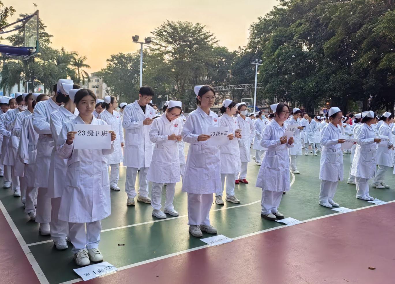 2025年12月8日清晨,广州校区生活园篮球场迎来一群靓丽的身影-﹣护理学院全体师生整齐列队,在微亮的晨光中静待升旗时刻。学院党总支书记、执行院长王秀岚,副院长黄洛莹与同学们并肩而立,目光中流淌着共同的期待。