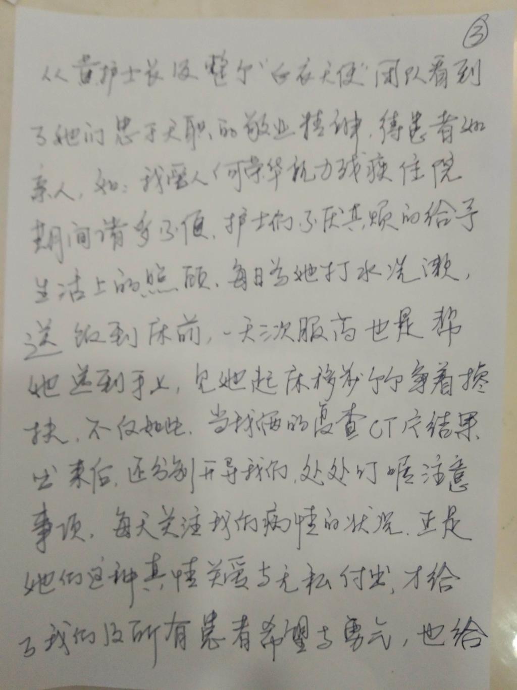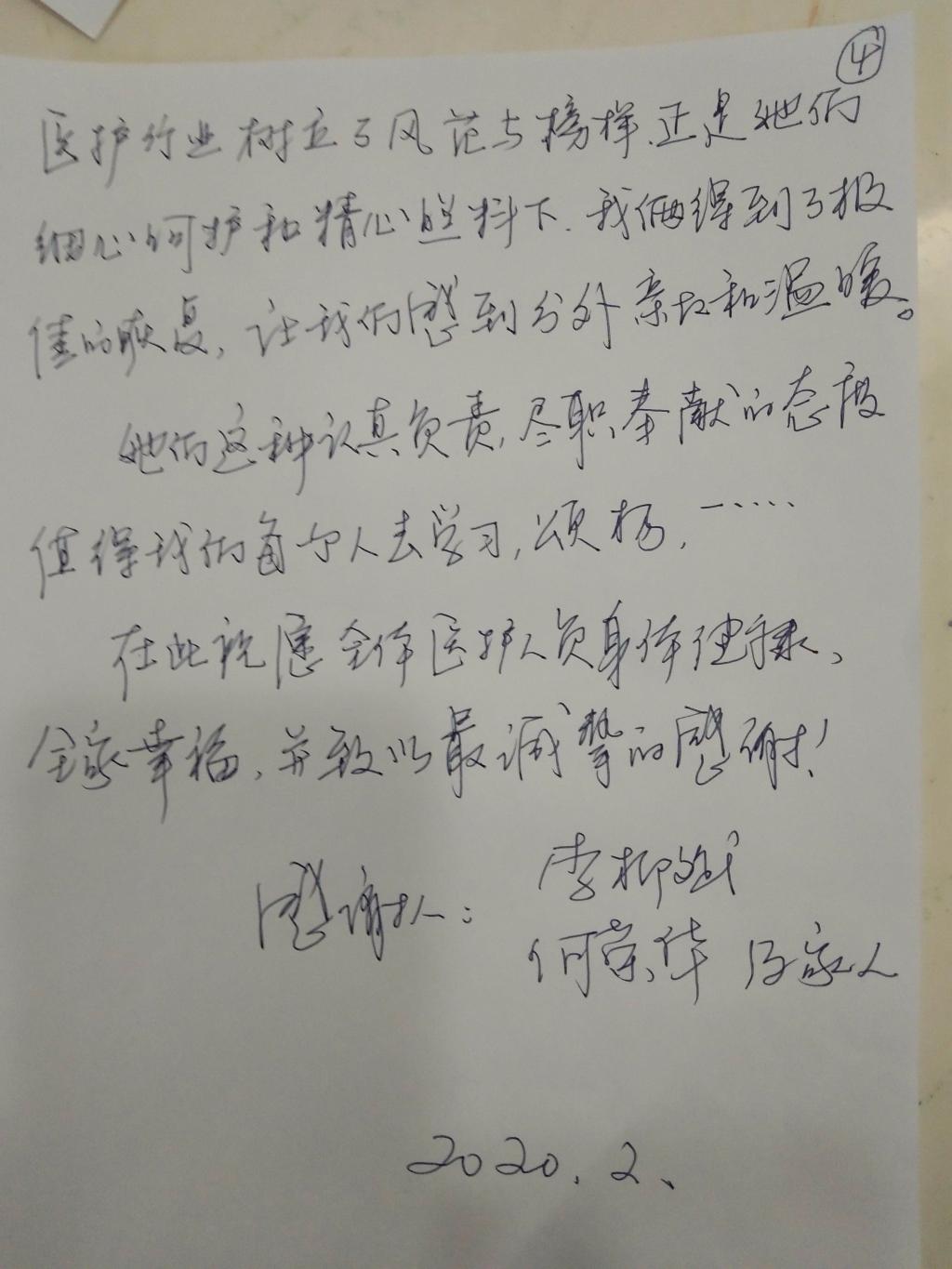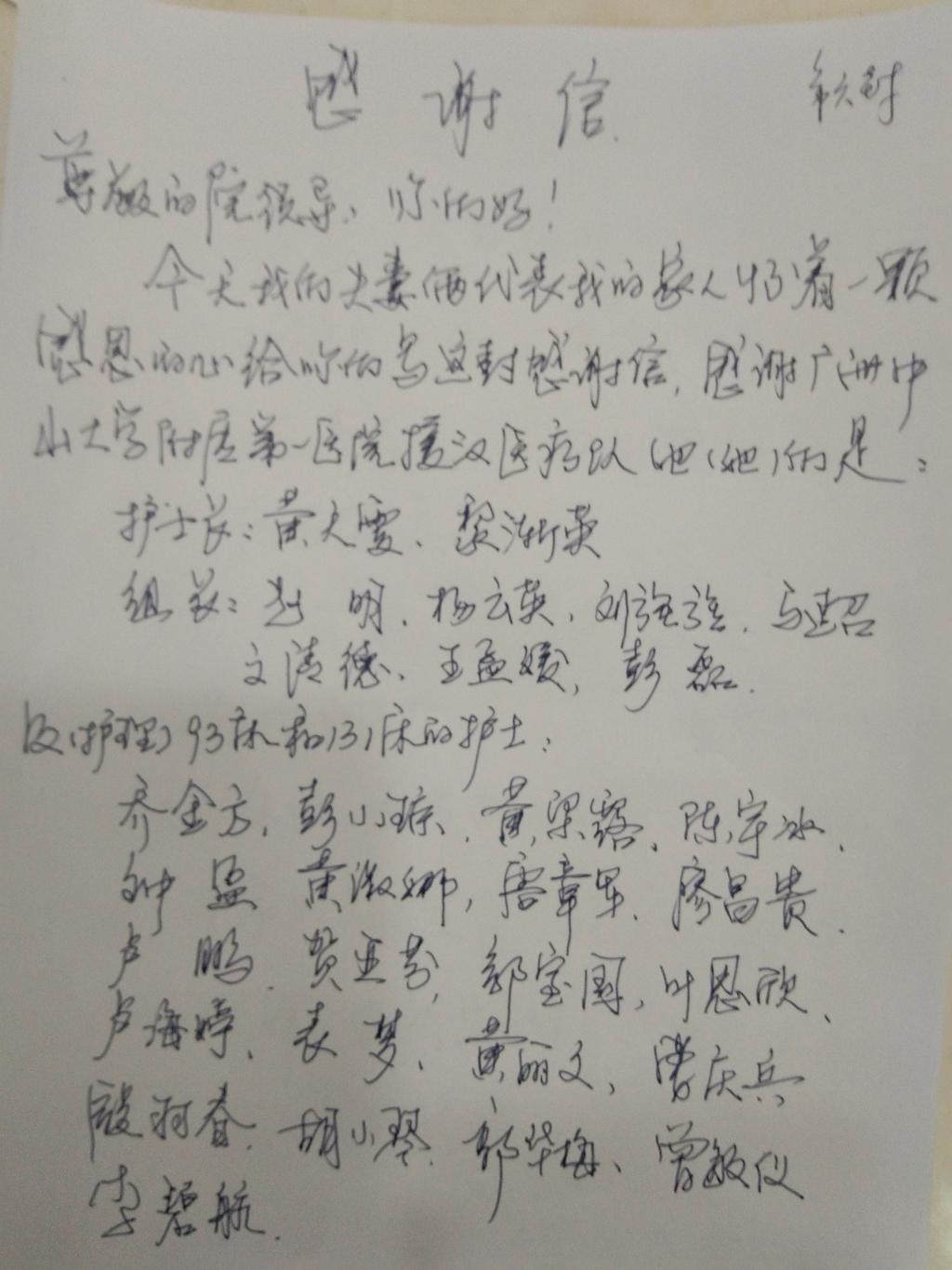 晚上7点,我正在12号病房外写交班,突然131床阿叔走到我的身旁,小声问:“小姑娘,你是不是广州中山一院的?”“是的。”“那你过来一下,有个事跟你说。”看阿叔一副神秘的样子,我也很好奇。只见他从裤兜里拿出几张卷的整整齐齐的纸对我说:“这是写给你们中山一团队的,很谢谢你们!我老婆住在93床,眼睛不好,你们也照顾的特别周全,很感谢!你看,我平时偷偷记下你们的名字,不知道写的对不对,如果名字写错,等会你来告诉我,我重新写一张。”原来是一封感谢信,满满的四页纸!一股温暖的火焰,直入我的心扉!