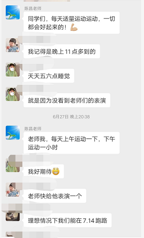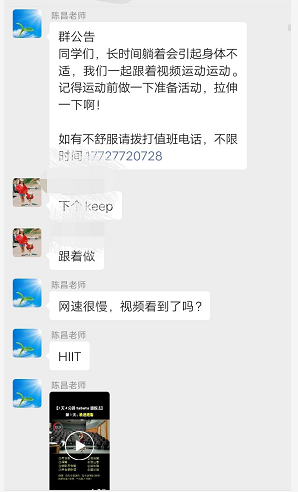 为了确保工作的顺利进行,小组负责人陈昌老师第一时间召集大家召开小组工作会议,确定了小组的工作方案和小组成员的具体分工。这几天以来,小组成员每天通过微信群以及电话实时关注每位学生的身体状况,处理突发事件以及对学生进行心理疏导,排除学生恐慌、焦虑等不良情绪,更好地帮助他们减轻疫情带来的心理伤害,让学生在疫情防控中坚定信心,共克时艰!隔离不隔爱,陪伴学生顺利渡过隔离期。